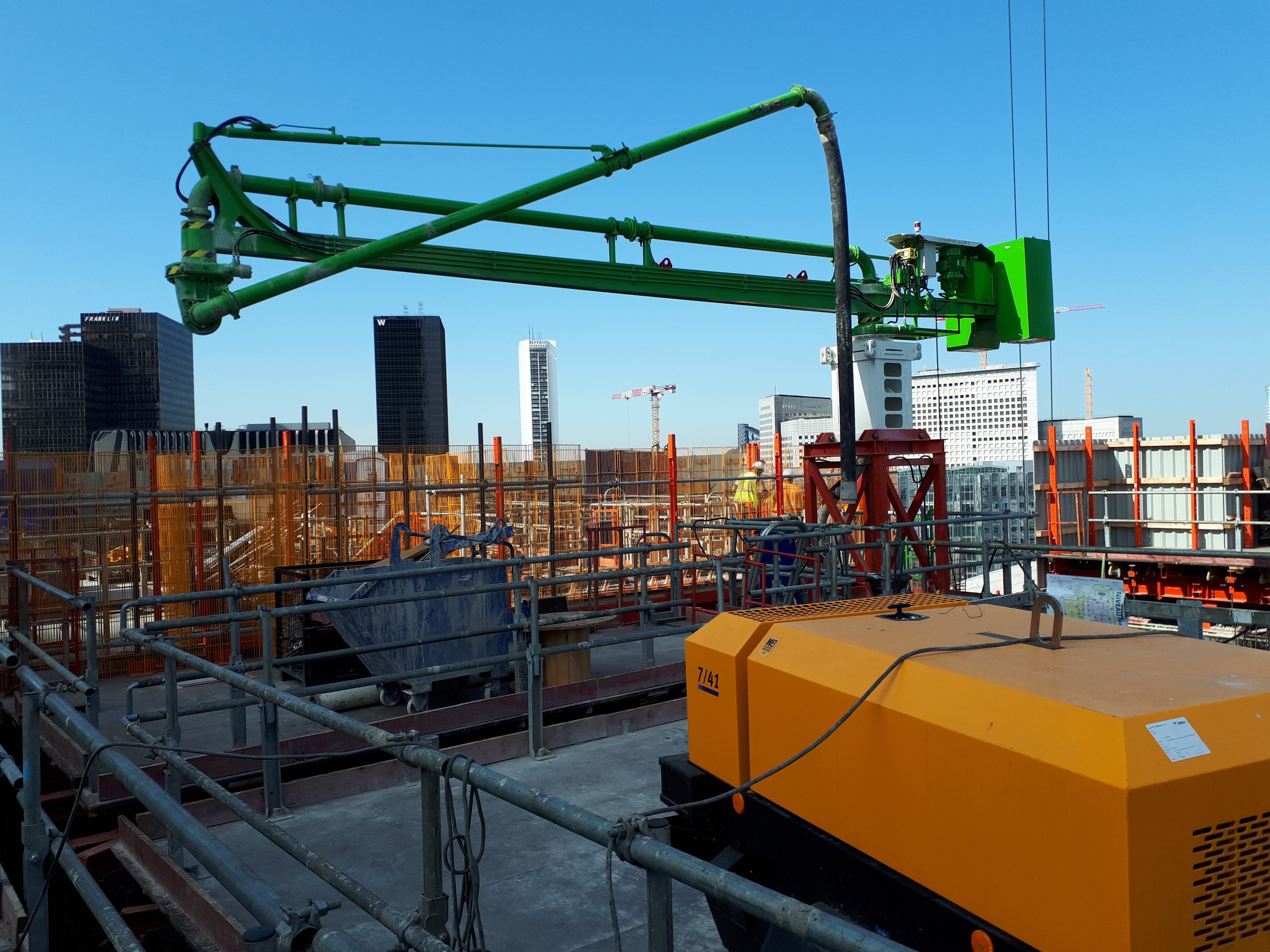 Distributeur de béton de type araignée mais adapté sur un mât autogrimpant.